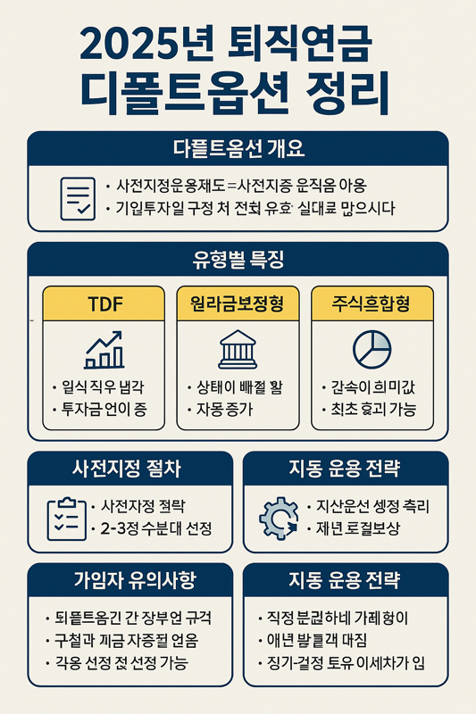 디폴트옵션(Default Option)은 퇴직연금 가입자가 별도로 운용 지시를 하지 않을 경우, 미리 지정된 운용방법에 따라 자동으로 자산이 운용되도록 하는 제도입니다. 2022년 법 개정 이후 2025년까지 확대 적용되며, **개인 선택의 수동성을 보완**해주는 수단으로 활용됩니다.